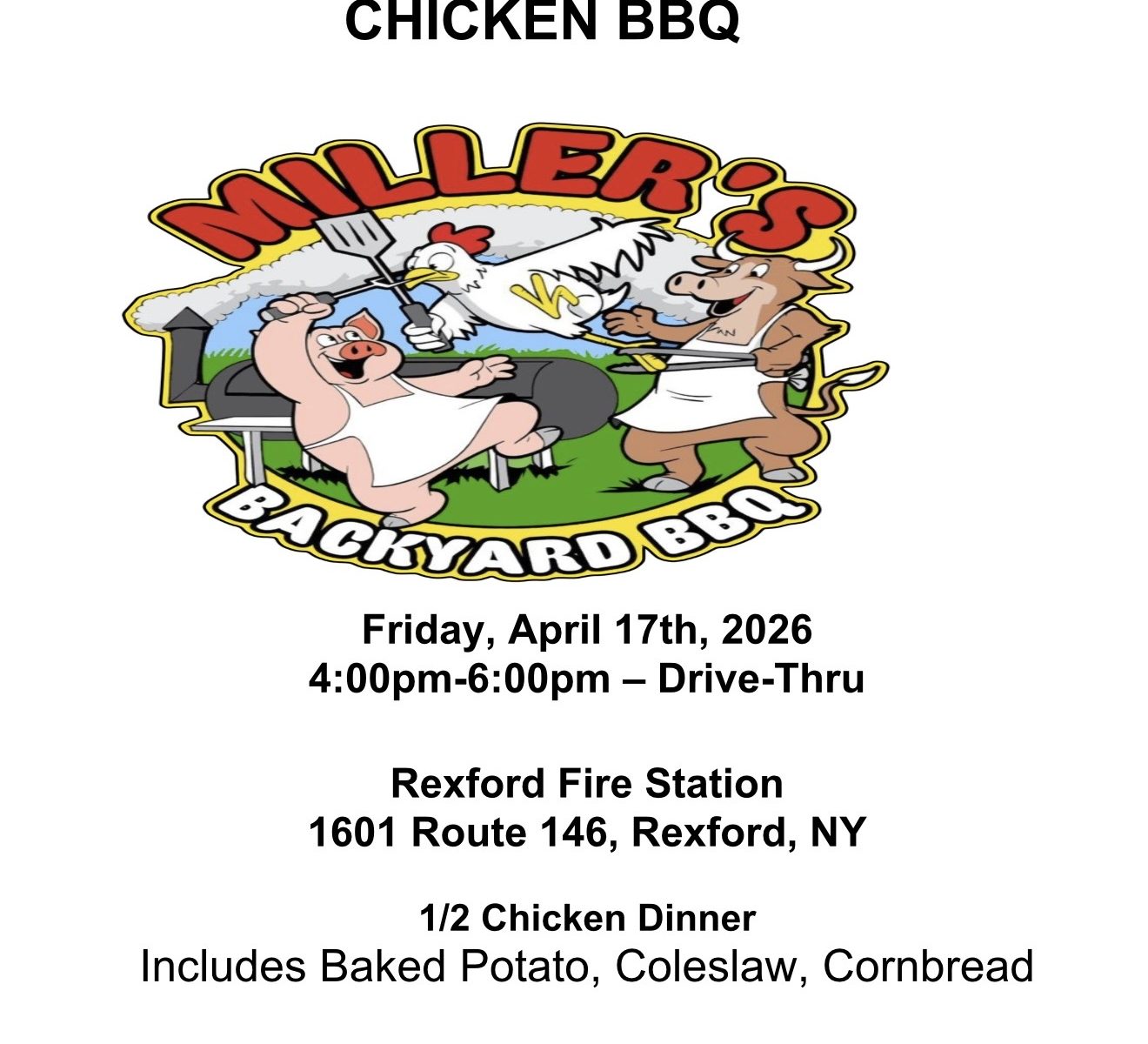 The chicken BBQ will include one half chicken, baked potato, coleslaw, and corn bread.